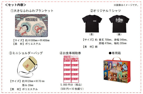 2024 モス福袋は、「笑顔もひらく宝箱」をテーマにモスバーガーのロゴとONE PIECEのキャラクターなどが描かれた特別な仕様になっている。中身は、「大きなふわふわブランケット」「オリジナルTシャツ」「ミニショルダーバッグ」と使い勝手のよいコラボグッズ3種類、お食事補助券5000円相当(500円×10枚綴り)が入っている。これらを、オリジナルデザインの専用箱に入れて提供する。