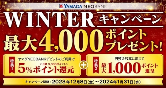 ヤマダデンキは、銀行サービス「ヤマダNEOBANK」で「WINTERキャンペーン」を12月8日から実施している。最大で4000ポイントのヤマダポイントをプレゼントするキャンペーンだ。
