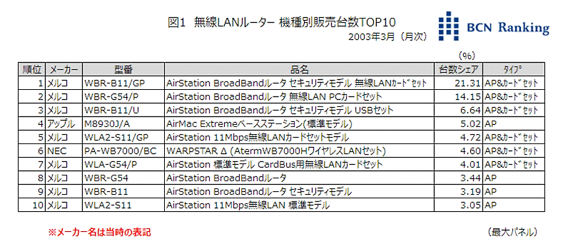 03年3月における無線LANルーターの機種別TOP10では、8機種をメルコ製品が占め、圧倒的な存在感を示していた。1位の「WBR-B11/GP」は対応している規格はIEEE 802.11bで、2位の「WBR-G54/P」はIEEE 802.11g。この2機種で市場の3割を超えるシェアを占めていた。メルコ以外にTOP10に入ったのはアップルの「M8930J/A」とNECの「PA-WB7000/BC」だった。