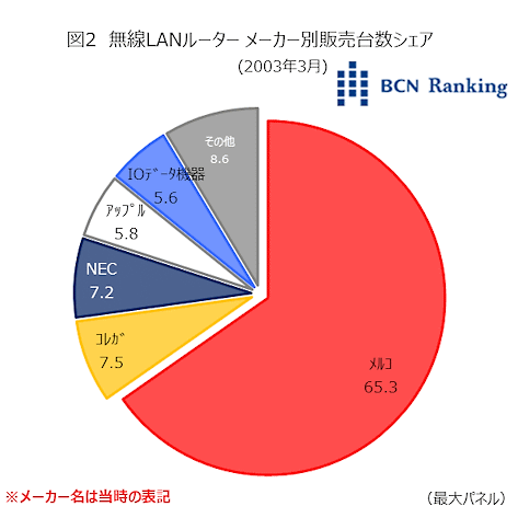 今回は2003年3月の無線LANルーター市場を取り上げる。当時、BCNが収集したデータによると、機種別上位の10機種中8機種が、メルコのAirStationだった。現在も無線LANルーター市場ではバッファローのシェアは高いが、20年前は6割を超えるシェアを占めていた。