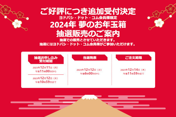 ヨドバシカメラは、ECサイト「ヨドバシ・ドット・コム」で福袋企画「2024年 夢のお年玉箱」の抽選申し込みを追加で受け付けている。期間は12月12日10時59分まで。