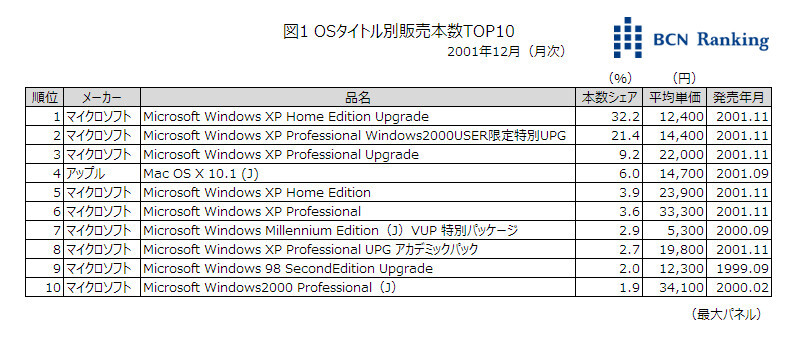 01年12月におけるOSのタイトル別TOP10では、9タイトルがWindowsだった。特に前月に発売になった「Windows XP」の色々なエディションがランクインしている。最もシェアが高かったのは「Windows XP Home Edition Upgrade」で32.2%。次いで「Windows XP Professional Windows2000USER特別限定UPG」が21.4%だった。この2タイトルで過半を占める状態で、Windows XPへの期待感のあらわれとも言えるような初動となった。唯一Windows以外の「Mac OS X 10.1(J)」は01年9月に発売になった製品でPuma(ピューマ)と呼ばれていた製品。