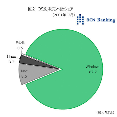 OS別の販売本数シェアでもWindowsの比率が最も高く87.7%。Macは8.5%に過ぎなかった。他にも当時は色々なメーカーがLinuxを販売していたこともあり、3.3%を占めた。その他には、DOS/Vや国産OSのB-TRONが含まれていた。