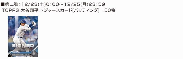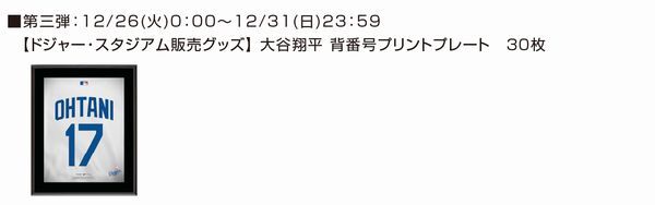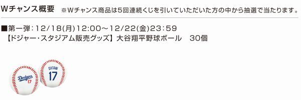 さらに、5回連続でくじを引いた人にはWチャンス賞品として、ロスのドジャー・スタジアムにて販売されている大谷翔平選手のグッズなどが155名にプレゼントされる(予定数量に達し次第終了)。