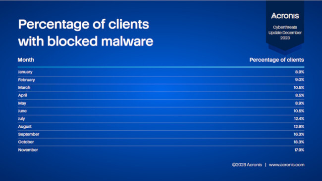11月に少なくとも一つのマルウェア脅威がブロックされたアクロニスのクライアントの割合は17.9%だった。この数字は、これまで年間を通じて12%前後で推移している。