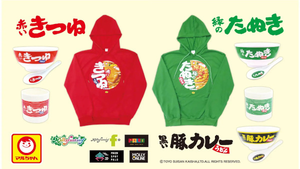 商品には、「フードパーカー」「メラミン食器セット」「スプリング」など、胸元に赤いきつね、緑のたぬきのパッケージやロゴがデザインされており、全7種類から選ぶことができる。さらに、モーリーオンラインとPRIZE SPOT PALOでは、「黒い豚カレーうどん」のロゴがデザインされたメラミン食器セットも限定で展開する。新商品は、景品として提供され、赤いきつねと緑のたぬきのフードパーカーは全2種類、着丈約64cm×身幅51cmの男性フリーサイズで提供される。また、赤いきつねと緑のたぬきのメラミン食器セットも全2種類、サイズは縦が約7.4cm×横14.9cm×奥行14.9cmで、軽くて割れにくいプラスチック素材を使用している。さらに、赤いきつねと緑のたぬきのスプリングも全2種類で、サイズは縦が約5.5cm×横5.4cm×奥行5.4cmだ。限定商品の黒い豚カレーうどんのメラミン食器セットは全1種類で、サイズは縦が約7.4cm×横14.9cm×奥行14.9cmとなっている。