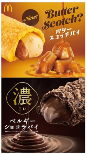 日本マクドナルドは、とろけるクリームがぎっしり詰まったホットスイーツ「とろけるホットパイ」から、新作の「バタースコッチパイ」とリニューアルした「ベルギーショコラパイ」の2商品を全国のマクドナルド店舗で1月10日から期間限定で販売する。