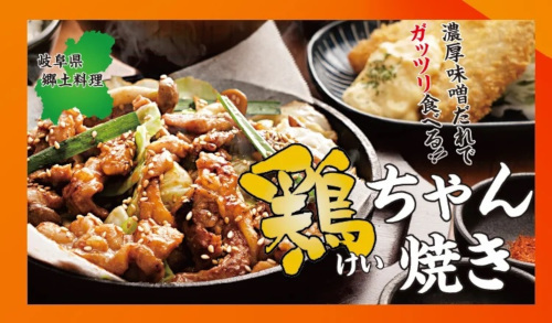 飛騨名物 鶏ちゃん焼き定食は、岐阜県南飛騨地方の名物料理「鶏ちゃん焼き」を宮本むなしの定食に仕立てた新メニュー。鶏ちゃん焼きは、食肉が貴重だった昭和中期に、お盆や正月など親族の集まりや来客時など特別な時に振る舞われていたものだ。