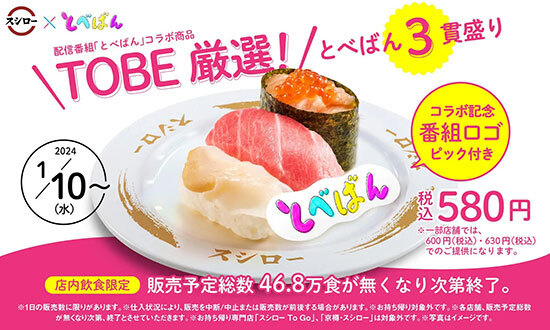 あきんどスシローは、芸能事務所「TOBE」所属のアーティストが出演する配信番組「とべばん」内で決定したコラボ商品「TOBE厳選!とべばん3貫盛り」を全国のスシローで1月10日から期間限定で発売した。価格は580円。販売期間は総数46.8万食がなくなるまでで、1日に販売数の限りがある。