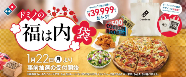 福袋はもともと2023年12月29日に販売予定だったが、販売延期となっていた。節分の時期に合わせて、「ドミノの福袋」を改めてドミノの“福は内”袋にバージョンアップ。「Set A」は、Lサイズピザ1枚、人気のサイドメニュー2品、ドミノ・ピザ オリジナルトートバッグ、3万9999円以上お得となるクーポン10種を1冊にまとめた「2024年ラッキークーポンブック」の計四つが詰め込まれている。また、「Set B」はトートバッグの代わりにサイドメニュー3品が選べる。販売予定数は、当初の3万個から2倍の6万個に増加。販売方法は、公平性を期して先着順から抽選予約販売に変更された。さらに、2024年ラッキークーポンブックの有効期限を25年1月末まで延長した。