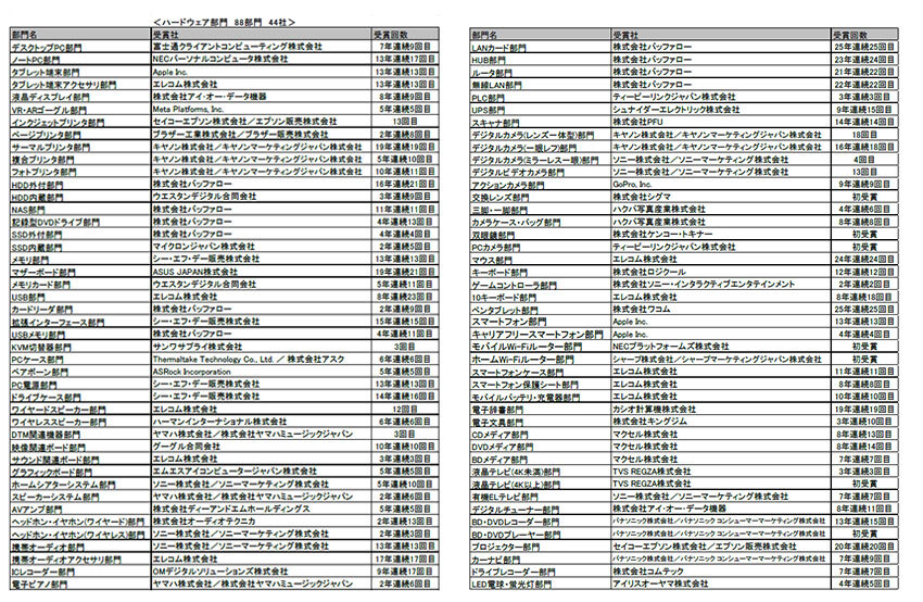 BCN AWARDの創設以来、25年連続でBCN AWARDを受賞した企業と部門は下記の通り。