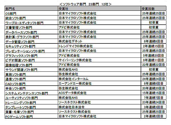 バッファロー(LANカード部門)/ワコム(ペンタブレット部門)/日本マイクロソフト(OS部門、統合ソフト部門、データベースソフト部門、表計算・グラフソフト部門、プレゼンテーションソフト部門)/弥生(業務ソフト部門)/ソースネクスト(葉書・毛筆ソフト部門)