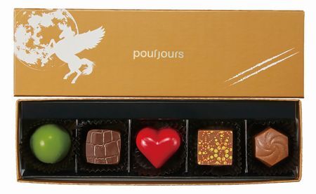 「ボンボンショコラ(5個入り)」には抹茶ドーム、フィユティーヌ、ティーハート、マンゴーパッション、キャラメルブールサレが、「ボンボンショコラ(10個入り)」には抹茶ドーム、フィユティーヌ、ティーハート、マンゴーパッション、キャラメルブールサレ、ディタ、りんご、コアントロー、ジャンドーヤベース、ロゼハートが入っている。