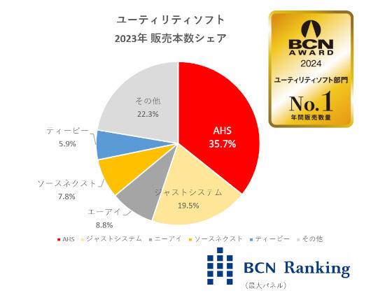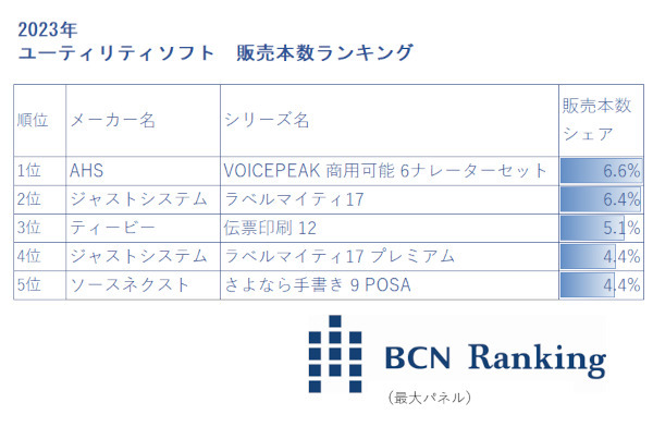 まず、7年連続7回目の受賞となった「ユーティリティソフト」部門でのAHSの強みを紹介しよう。ユーティリティソフトは「ラベル作成」「伝票印刷」といった事務作業や「PC最適化」などのさまざまなお役立ちソフトを対象とした部門で、23年は一般企業からの引きも強いAHSの「VOICEPEAK 商用可能6ナレーターセット」が年間を通じて最も多く売れ、AHSのシェアは前年を超える35.7%に達した。