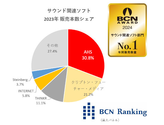 家電量販店・オンラインショップの実売データを集計した「BCNランキング」をもとに、部門(ジャンル)ごとに年間販売数量累計1位の企業を表彰する「BCN AWARD」は、今年、25回目を迎え、111部門・56社が受賞した。2023年1月1日~12月31日の年間データを集計した「BCN AWARD 2024」のトピックスの一つは、「サウンド関連ソフト」部門の1位交代。「Synthesizer V」シリーズを手がけるAHSが初受賞を果たしたのだ。同社は前年に引き続き「ユーティリティソフト」部門も受賞し、ダブル受賞となった。