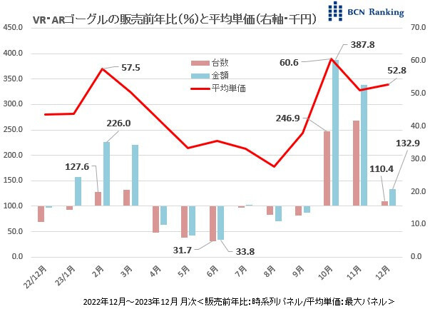 しかし翌7月、Meta Platformsの「Meta Quest 2」の128GBモデルの平均単価が3万円台まで下落。販売台数前年比は97.2%と前年並みまで回復した。販売金額は102.9%と、わずかながら前年を上回った。8月、9月は再び台数、金額ともに2桁割れに逆戻りした。そして10月、新製品「Meta Quest 3」の発売で市場は大いに活性化。販売台数前年比が246.9%、金額が387.8%に跳ね上がった。平均単価もこの1年で最高の6万600円まで上昇。翌11月も勢いは持続し、市場は大いに盛り上がった。しかし、12月には勢いが鈍化。それでも台数110.4%、金額132.9%と2桁の伸びを維持している。