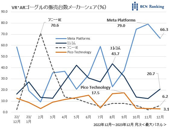 メーカーシェアも入れ替わりが激しい。昨年2月、ソニー・IEがPlayStation VR2を発売すると、販売台数シェアは70.6%まで急上昇しトップシェアを獲得。この勢いが衰えると、Meta Platformsにトップが交代。2社の攻防の合間に、スマートフォンを挿入するタイプの製品を扱うエレコムがトップを奪う場面もあった。直近では、Meta Quest 3を発売したMeta Platformsが11月に79.0%と圧倒的なシェアを獲得した。同社のQestシリーズは2019年発売のOculus Questから、Qest 2、Qest Proを経て今作で4代目。PlayStation VR2と同様、ゲームなどの用途が中心だが、数万円で楽しめるとあって人気を得ている。