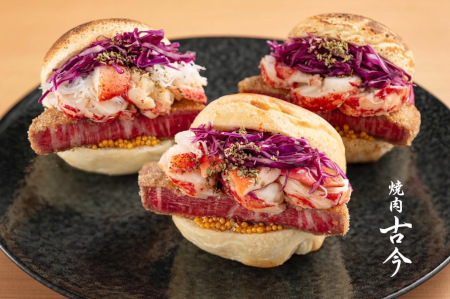 絶対的な自信から、グランドメニューは「おまかせコース」(価格は2万2000円)のみの提供で、生肉のユッケから始まり、特選タン、ハラミといった厳選の希少部位10種を、特製の10種のタレとともに楽しめる。看板メニューである「古今ロイヤルバーガー」には、シャトーブリアンカツとオマール海老を贅沢に使用するほか、コース終盤には季節食材と和牛の土鍋ご飯も用意している。