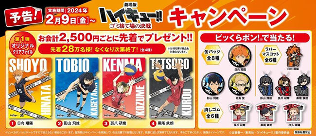 『劇場版ハイキュー!! ゴミ捨て場の決戦』の公開を記念し、回転寿司チェーン「くら寿司」で期間限定でアニメ『ハイキュー!!』とのコラボキャンペーンを2月9日に開始する。期間は2月29日までで、なくなり次第終了となる。