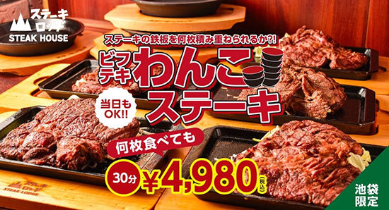 ステーキハウス「ステーキロッヂ 池袋店」で、「肉の日」である2月9日から「ビフテキわんこステーキ」を提供している。30分食べ放題制のスペシャルメニューだ。価格は4980円。ライスとスープは、別途注文が必要となる。2月11日(本日)も実施しており、「わんこそば記念日」を祝うこともできる。
