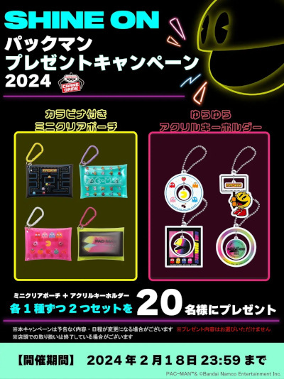 さらに、パックマン公式Xで「【SHINE ON】パックマンプレゼントキャンペーン2024」を開催。パックマン公式Xアカウントをフォローし、対象の投稿を「いいね+リポスト」すると抽選で20人に、パックマン ゆらゆらアクリルキーホルダーとパックマン カラビナ付きミニクリアポーチから各1種、計2個セットが当たる。