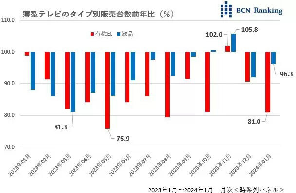 有機ELテレビが大苦戦している。一時はコロナ特需に沸いたテレビ市場。コロナ明けに伴って人々の目が「外」に向くようになると一転、反動減に苦しんでいる。特に単価が高い有機ELテレビの落ち込みが激しい。この1月、販売台数は前年同月比で約2割減少。液晶テレビもマイナス基調だが、有機ELテレビの減少スピードはさらに速い。この市場縮小をもたらしたのは誰か。逆風の中でも健闘しているのは誰か。