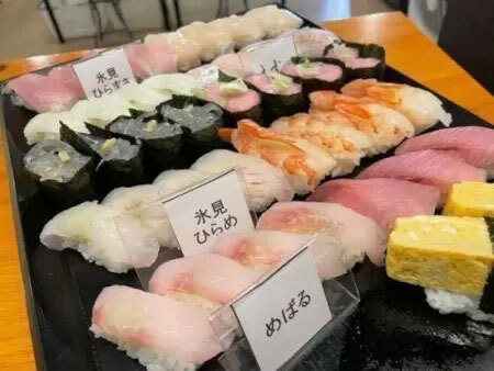 寿司食べ放題は、富山県氷見と北海道函館を中心に、漁港直送の鮮魚など約20種以上のネタを取り揃える。また、痛風鍋は冬季限定で毎年提供しており、あん肝、白子、牡蠣が入っている。また、寿司食べ放題と痛風鍋のセットも通常価格6000円のところ5000円(現金の場合。現金以外の支払いなら5250円)で注文できる。