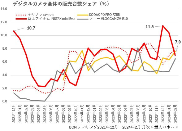 富士フイルムといえば、INSTAX mini EVOが売れに売れている。デジタルとアナログのハイブリッドカメラで、デジタルカメラ全体のBCNランキングでも、売り上げTOP3の常連だ。2021年12月の発売以来、ランキング1位と2位がそれぞれ8回、3位が2回。トップ3に入った回数は、27カ月中18回にも及ぶ。カメラとしては久々の大ヒット商品になった。現在でもトップを争うポジションで奮闘している。デジカメでありながら、撮ったその場で紙の写真が出てくるというのが大きな魅力だ。もう一つ、100通りの多彩なエフェクトが写真にかけられる、というものも人気の源。発売から2年以上たっても売れ続けているのは、エフェクトが生み出す写真の楽しさが負うところも大きい。INSTAX mini 99は、この多彩なエフェクトをアナログカメラでアナログに実現しようとした挑戦ともいえるだろう。