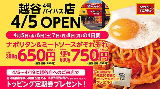 オープン記念として5日から8日までの4日間、パンチョの人気メニュー「ナポリタン」「ミートソース」を小サイズで650円、並~メガサイズで750円と割引価格で提供。テイクアウトは容器代100円追加となる。また、各日先着30人にオリジナルポーチをプレゼントする。さらに5日から19日までの期間、来店客全員に240円までのトッピングに使える店舗限定トッピング定期券をプレゼントする。トッピング定期券の有効期限は6月末まで。加えてパンチョ公式アプリをダウンロードし、越谷4号バイパス店を「お気に入り登録」するとトッピング「王道セット」の無料クーポンを提供する(有効期限は6月末)。