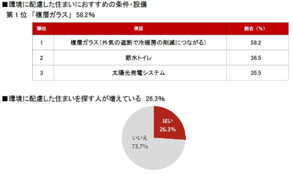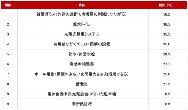 不動産のプロである不動産会社の人に、環境に配慮した住まいにおすすめの条件・設備を聞いたところ、「複層ガラス」が1位、「節水トイレ」が2位、「太陽光発電システム」が3位となった。