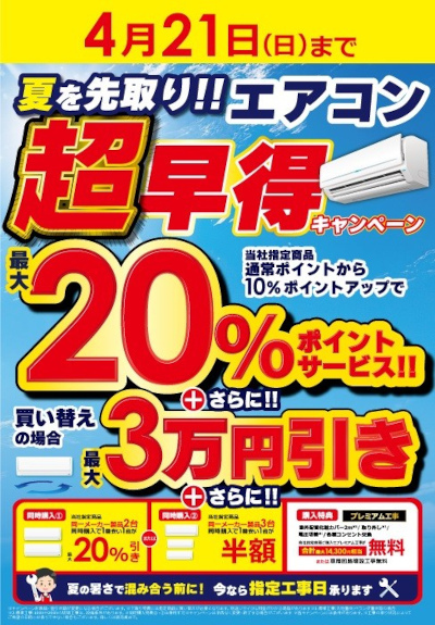 ビックカメラは4月6日から4月21日までの期間、「エアコン超早得キャンペーン」を開催する。指定エアコン購入のポイント還元率を最大20%とするほか、古いエアコンからの買い替えで最大3万円引きとなる。
