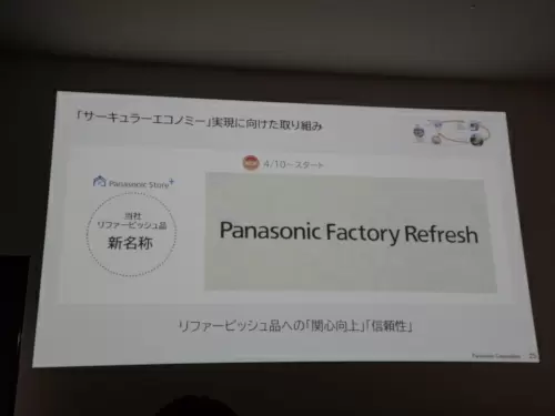 パナソニックは4月10日、国内BtoCマーケティングにおける「新たな商売の基準」と題する説明会を開催。その中でサーキュラーエコノミーの実現に向けた新サービスとして、同社の厳格な基準で検査した再生品(保証付)を「Panasonic Factory Refresh」ブランドで自社ECのPanasonic Store Plusで販売、または定額利用サービス販売すると発表した。指定価格製品のうち10カテゴリーが対象になる。