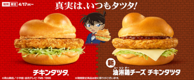日本マクドナルド(マクドナルド)は、ふわふわバンズの「チキンタツタ」で「名探偵コナン」とコラボする。チキンタツタをはじめ、タツタパティのおいしさが際立つ新メニューの「油淋鶏チーズ チキンタツタ」が登場するほか、「シャカシャカポテト 焼きとうもろこし味」や「マックフィズ/マックフロート 3種のかんきつミックス」などを期間限定で販売する。