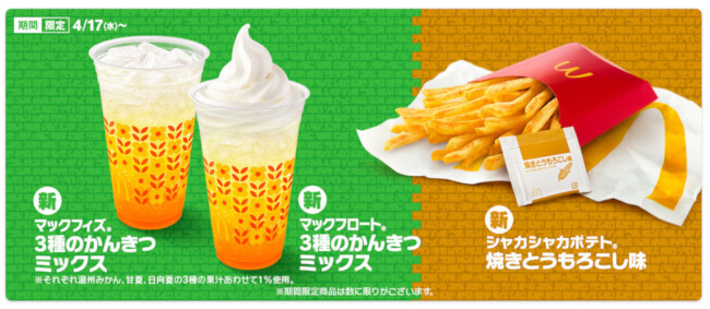 マックフィズ 3種のかんきつミックスは、温州みかん、甘夏、日向夏果汁をブレンドした、さわやかな香りとまろやかな酸味が楽しめる炭酸飲料。マックフロート 3種のかんきつミックスは、マックフィズ 3種のかんきつミックスに滑らかでコクのあるソフトクリームをトッピングし、さわやかでリッチな味わいのデザートドリンクに仕上げている。