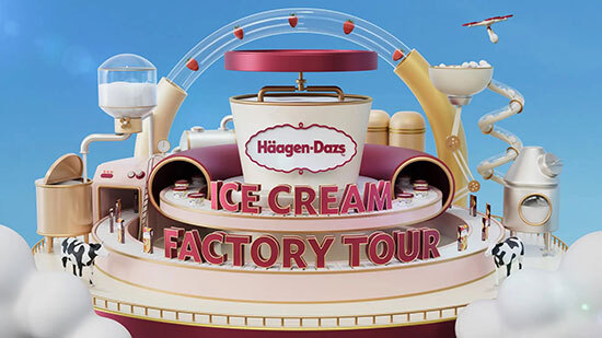 Haagen-Dazs ICE CREAM FACTORY TOURは、ハーゲンダッツ アイスクリームの製造工程やこだわり、秘密を、3DCGや実写、アニメーション映像を通じて、バーチャル上で工場見学ができるコンテンツ。大人も子どもも楽しみながら学べる内容で、実際の工場で見えない製造工程を3DCGやアニメーションで表現している。