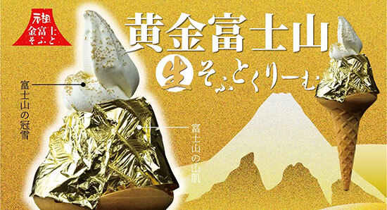 富士山の登山用品レンタルショップなどを運営し、訪日外国人旅行者向けの観光事業を手掛けるJバウンドは、ゴールデンウィーク(GW)初日の4月27日、山梨県の観光情報等を発信する複合型アンテナショップ「ふじさんプラザ」で金沢の金箔を使った「黄金富士山(おうごんふじさん)そふとくりーむ」の販売を開始する。価格は「1(いー)2(ふ)2(じ)3(さん)」ということで1223円。