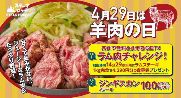 価値創り研究所が運営するステーキハウス「ステーキロッヂ 秋葉原店」は、4月29日(本日)の「羊肉の日」を記念してラム肉メニュー「ジンギスカンステーキ」を100円割引で提供する。また、「ラム肉チャレンジ」メニューも1日限定で用意。制限時間14分29秒以内にラムステーキ1kgとたっぷりの野菜を完食した人は代金が無料になる。さらに、次回以降使える4290円分の食事券をプレゼントする。