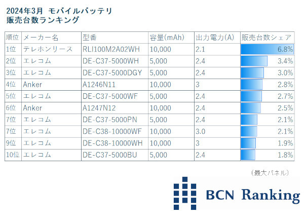 家電量販店・オンラインショップの実売データを集計した「BCNランキング」によると、24年3月に最も多く売れたモバイルバッテリは、テレホンリースの「RLI100M2A02WH」だった。2位・3位はエレコムの「DE-C37-5000WH」「DE-C37-5000DGY」が続き、4位にAnker「A1246N11」が入った。バッテリ容量はいずれも1万または5000mAh。大容量だと重さがかさみ、持ち運びの負担が増えるため、薄く軽く、容量はそこそこという機種が選ばれているようだ。税別平均単価は3216円で、上位3位以内の機種に限ると、すべて税別2000円未満だった。