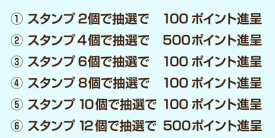 スタンプ2個獲得で1回目抽選100ポイント、スタンプ4個獲得で2回目抽選500ポイント、スタンプ6個獲得で3回目抽選100ポイント、スタンプ8個獲得で4回目抽選100ポイント、スタンプ10個獲得で5回目抽選100ポイント、スタンプ12個獲得で6回目抽選500ポイントを進呈する。さらに、スタンプを12個獲得すると、1口200ポイントを上限に100万ポイント山分けする抽選に参加できる。