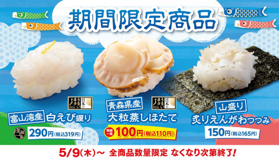 はま寿司は、「富山湾産白えび握り」をはじめとした期間限定の3品を5月9日から提供する。