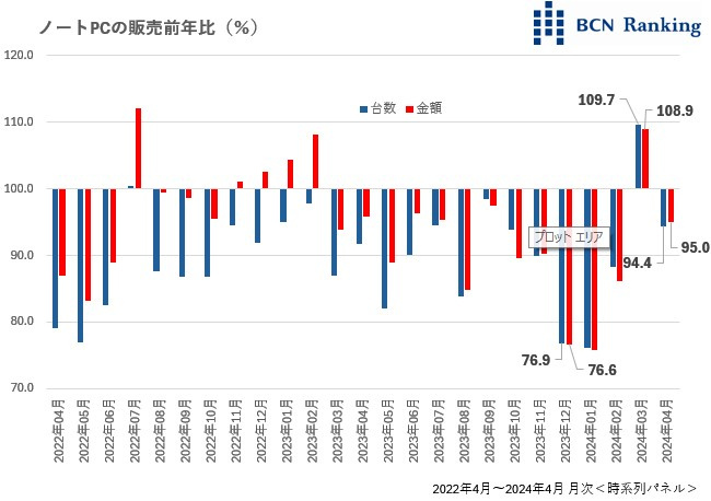 ノートPCが苦戦している。コロナ禍では特需が生まれ活況に沸いたノートPCだが、23年3月からは、台数、金額とも継続的に前年割れ。今年の3月まで台数と金額のいずれも前年を上回ることはなかった。昨年の年末商戦の落ち込みが特に大きく、12月、1月ともに前年を2割以上下回った。この3月、販売台数前年比109.7%、金額108.9%と、2022年7月以降20カ月ぶりに台数、金額がそろって前年を上回った。しかし、4月には台数94.4%、金額95.0%と再び前年割れに逆戻り。全国2300店の家電量販店やネットショップなどの売り上げを集計するBCNランキングで明らかになった。この不調はいつまで続くのか。