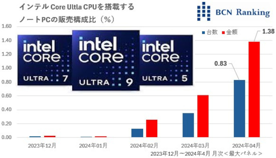 一方、ここに来て一気に期待感が盛り上がっているのがAI PCだ。インテルが昨年12月に発売したCPU「Core Ultra」シリーズは、NPU(Neural Processing Unit)を備えるAIチップ。徐々にではあるがノートPCに搭載され始めている。実際には4月現在で、ノートPC全体に占めるCore Ultra搭載モデルの台数構成比は0.83%、金額構成比でも1.38%という状況だ。AI PCに対応するソフトもまだ少ない。メーカー関係者からは「正直言って、今の時点でAIチップを搭載してどんなメリットがあるのか、イマイチよく分からない」という声も聞く。しかし「AI PCはインターネットの登場に匹敵するインパクトがある。今年の夏以降、秋ごろからドライブをかけていく」と話すメーカー関係者も多い。今後、AI PCに市場を刷新するパワーがあるかどうかは未知数だ。しかし、AI PCのプロモーションが本格化する今年の夏以降には、ノートPCに勢いが戻る可能性が出てきた、とは言えそうだ。(BCN・道越一郎)