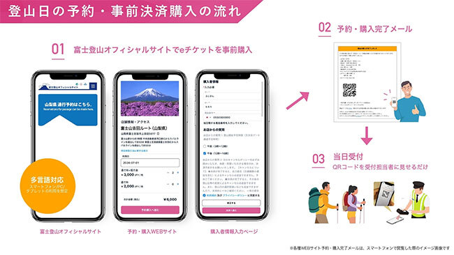 同サービスを活用した「山梨県富士山吉田ルート通行予約システム」は、登山用eチケットの予約管理、登山前の事前決済、購入者へのeチケット送付(メール)、チケット引換対応に加え、オンライン上で空き枠の在庫管理などをシームレスに行うことができるシステム。富士登山オフィシャルサイトで5月20日から多言語対応で一般公開となり、事前購入が可能となる。登山客は、購入したeチケット記載のQRコードを富士山吉田口五合目(富士スバルライン五合目)窓口でスキャンして通行することができる。