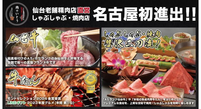 仙台では誰もが知る創業57年の老舗精肉店「肉のいとう」は、最高級A5ランク仙台牛と肉厚牛たんを、しゃぶしゃぶと焼肉の両方で贅沢に楽しめる「仙台牛と牛たん 肉のいとう 名駅三丁目店」を5月31日にオープンする。
