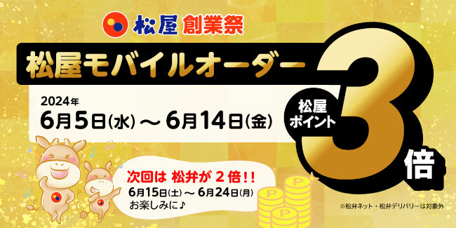 松屋フーズは「松屋創業祭」を記念して6月5~14日の期間、「松屋モバイルオーダー」の付与ポイントを通常の3倍にするキャンペーンを開催する。「松屋」「松のや」「マイカリー食堂」「ステーキ屋松」などが対象となる。