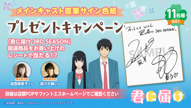 メインキャスト直筆サイン色紙プレゼントキャンペーンでは、コラボ期間中(6月19日~7月10日)に「ファントエス with 君に届け 3RD SEASON」関連商品を購入したレシートで、抽選で11人に黒沼爽子役/能登麻美子さん、風早翔太役/浪川大輔さんの直筆サイン入り色紙をプレゼントする。応募期間は6月19日から7月11日まで。また、コラボ期間中、ファントエス11店舗でサイン色紙を展示する予定。フォロー&リポストキャンペーンでは、ファントエス公式Xアカウントをフォローし、該当の投稿をリポストすると、抽選で5人に風早翔太役/浪川大輔さんの直筆サイン入りパネルが当たる。応募期間は6月13日から7月10日まで。