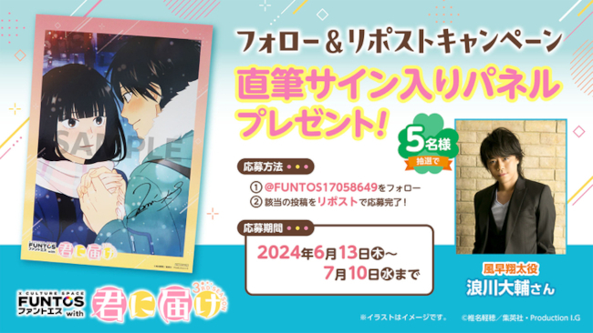 フォロー&リポストキャンペーンでは、ファントエス公式Xアカウントをフォローし、該当の投稿をリポストすると、抽選で5人に風早翔太役/浪川大輔さんの直筆サイン入りパネルが当たる。応募期間は6月13日から7月10日まで。