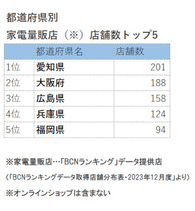 「BCNランキング」のデータ提供店に限ると、都道府県別店舗数は、201店舗の愛知県がトップ。続いて大阪府が188店舗で2位につけ、158店舗で広島県が3位に入った。愛知県と広島県はエディオン(旧エイデン・旧デオデオ含む)が多く、大阪府はエディオンと上新電機がほぼ同数の店舗を出店しているため、4位以下を大きく引き離している。