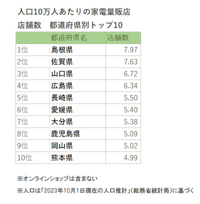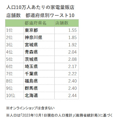 23年10月1日現在の日本人人口を全ての家電量販店の店舗数で割った、人口(日本人)10万人当たりの店舗数は2.94。人口10万人程度の自治体には2~3店舗がある計算だ。都道府県別では、島根県が7.97でトップ。2位は佐賀県(7.63)、3位は山口県(6.72)、4位は広島県(6.34)だった。ワースト1は東京都(1.55)で、神奈川県(1.85)、宮城県(1.92)と続く。