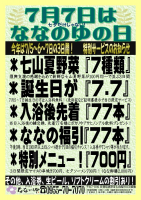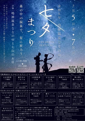 鳴神温泉(佐賀県唐津市)は7月5日(本日)から7日までの3日間限定で、日帰り温泉施設「ななのゆ」で七山地区の店舗と協力して七夕祭りを開催する。